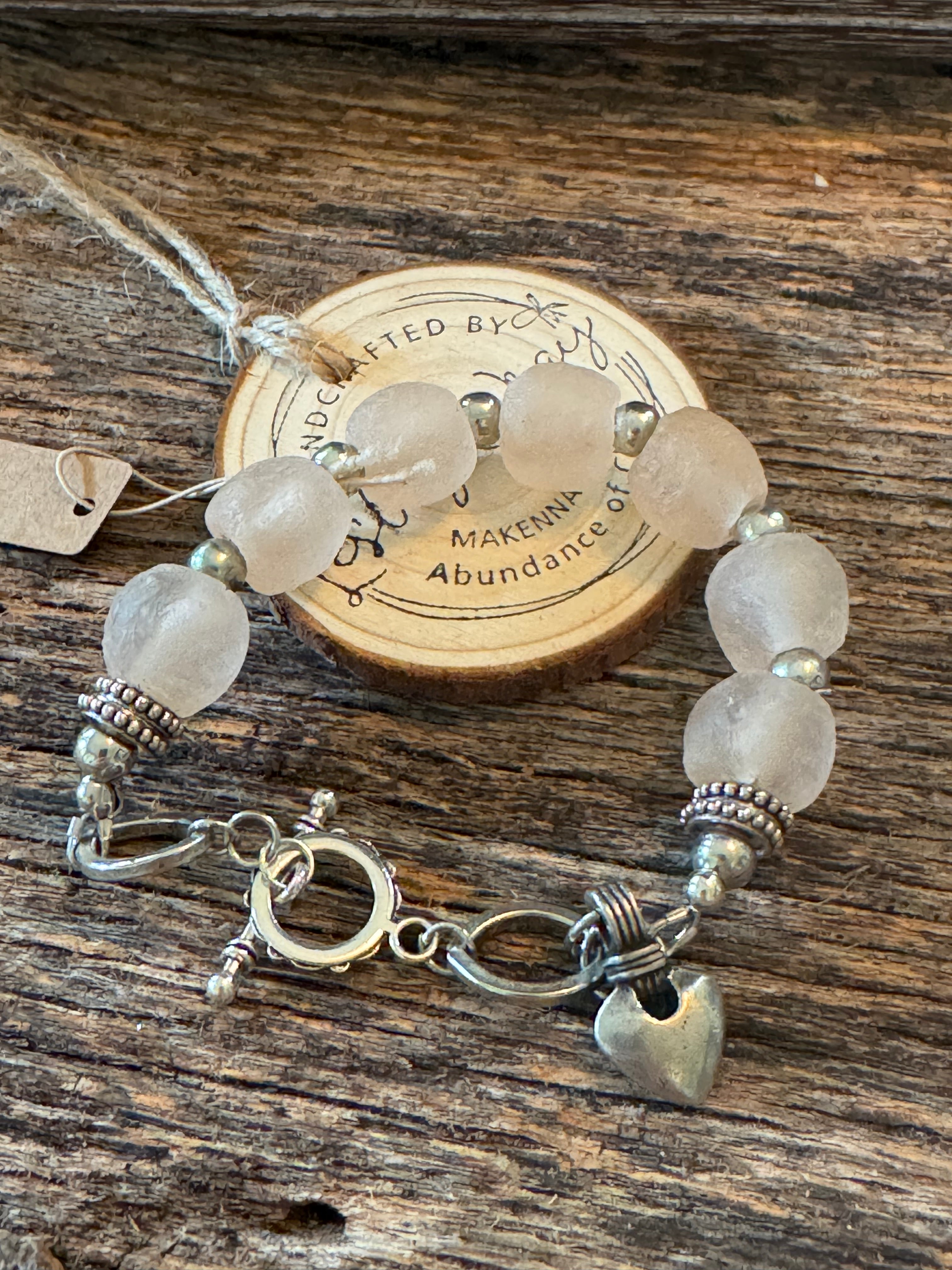 This boho inspired bracelet is a hand crafted piece featuring very pale pink/white recycled sea glass with silver accent beads and a silver heart charm. Its...