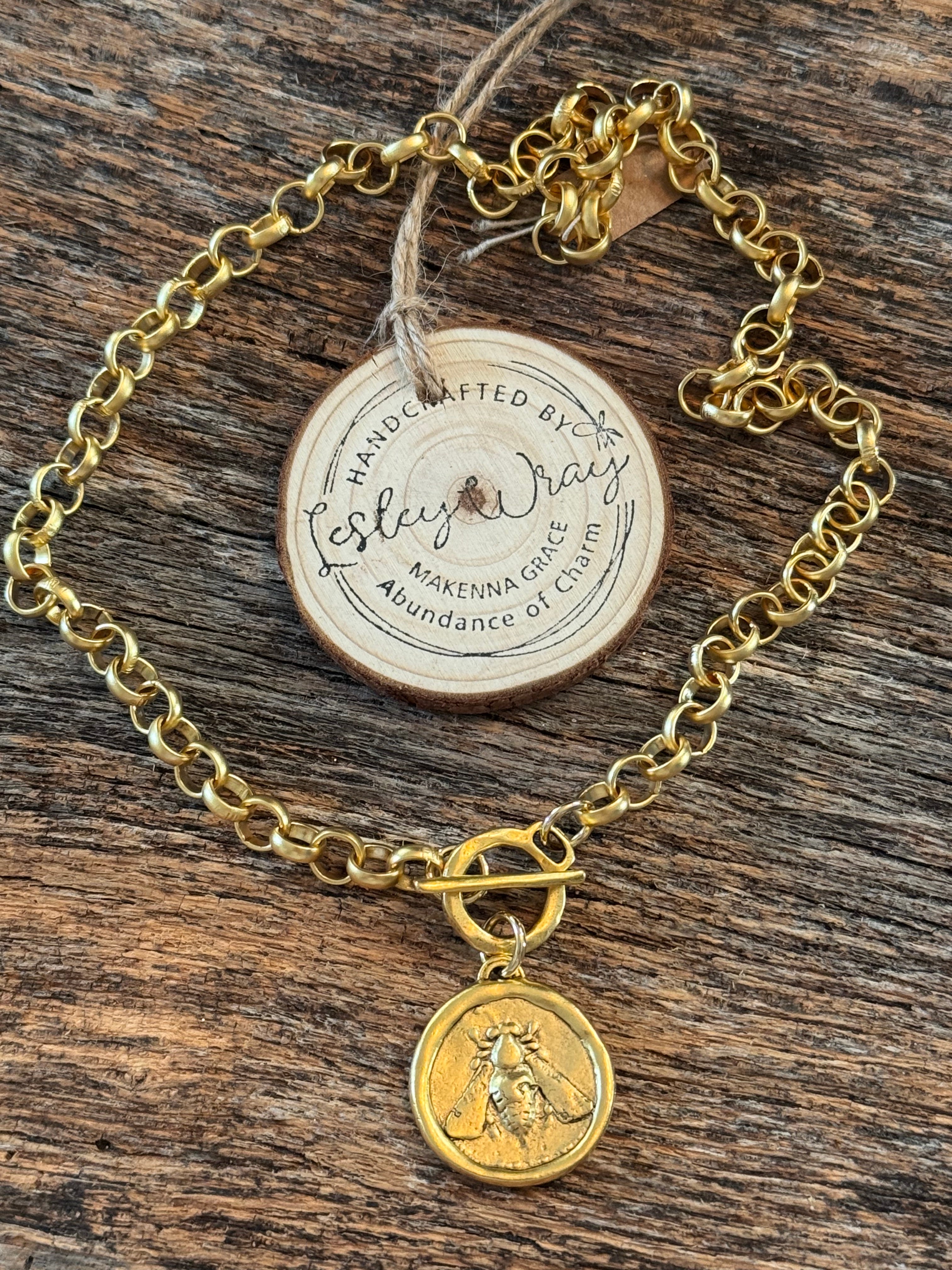 A chunky chain design, this gold front toggle closure necklace features a medium size coin charm with a bee engraved. The perfect addition to any outfit,...