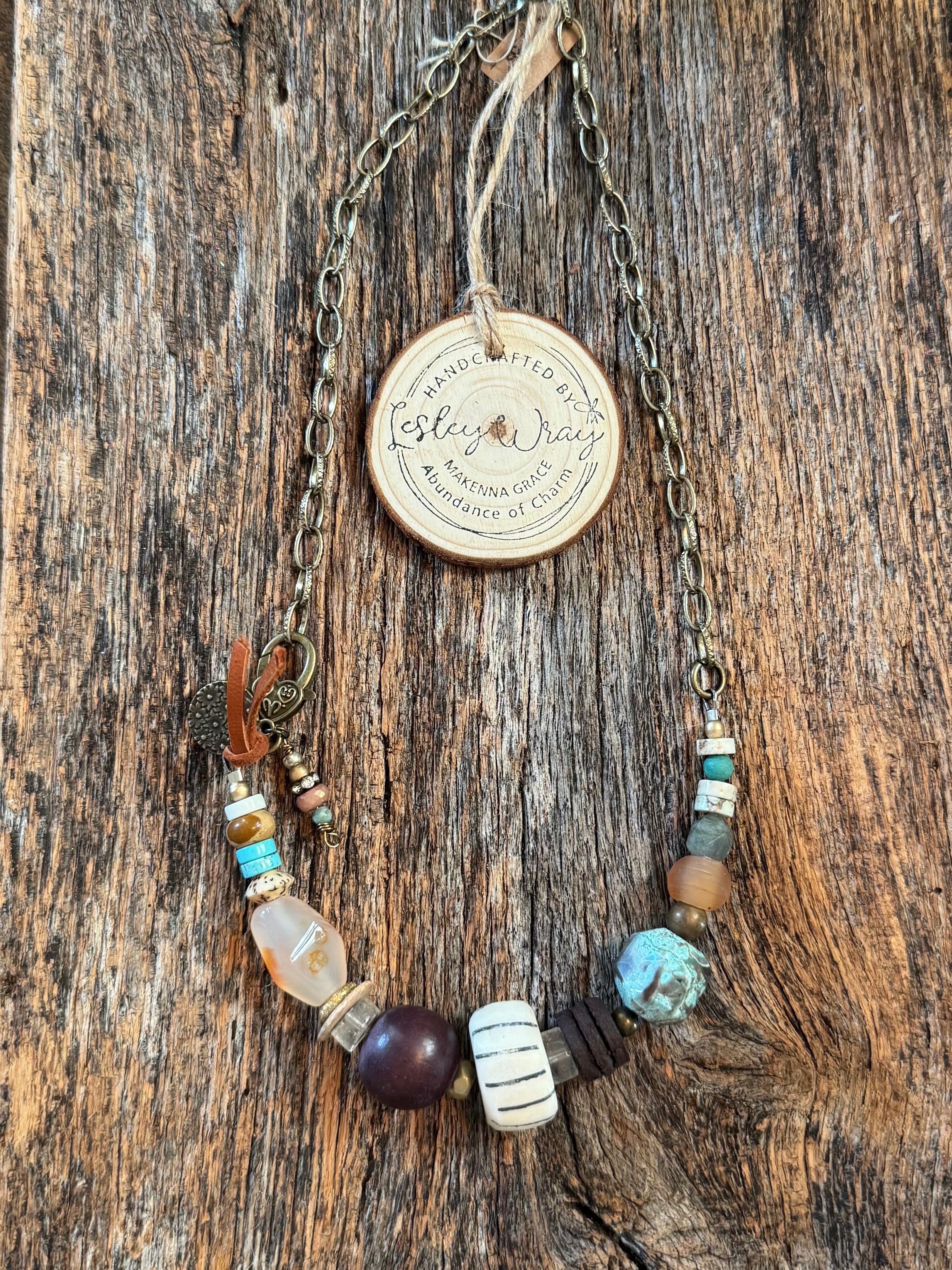 This boho beaded necklace features a stylish and comfortable flat dark brown suede leather strap, adorned with multiple shades of browns, creams, turquoise metal,wood and bone...