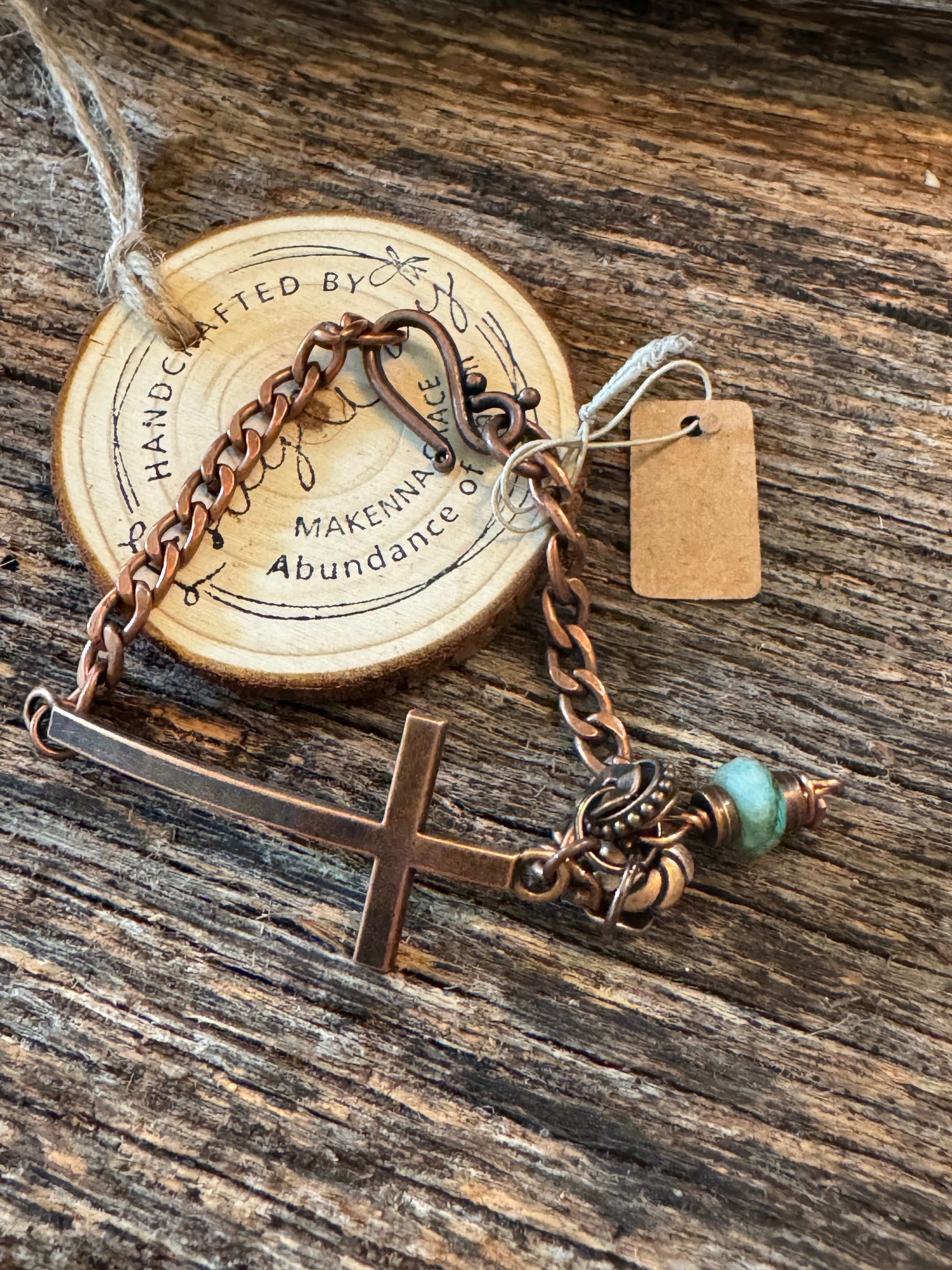 This boho inspired bracelet is a hand crafted piece featuring a metal copper Cross connector with antique copper curb chain and accents in copper and turquoise. Its toggle design adds versatility and ease of wear. Made with quality materials, this bracelet will add a touch of elegance to any outfit. TOGBR009