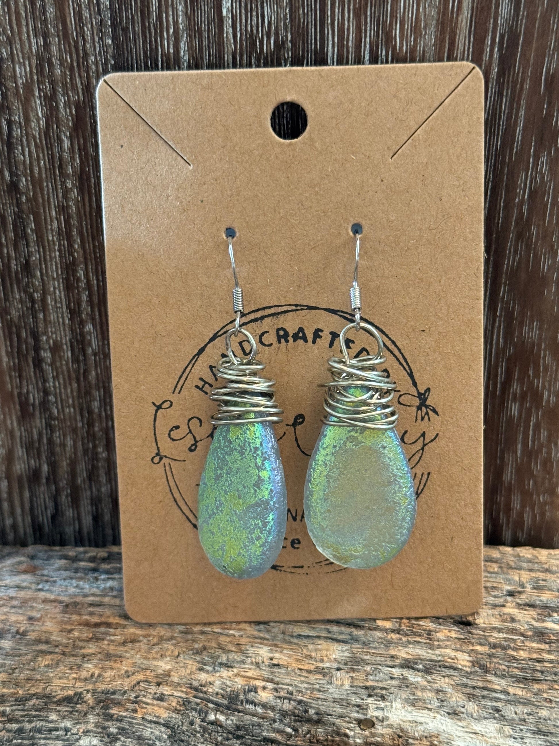 Hand crafted, these Czech Irridescent Glass Pendant Earrings are a stunning addition to any jewelry collection. Made with irridescent Czech glass flat teardrop etched in shades blue and green, accented with silver wire wrapping, these earrings are the perfect accessory to elevate any outfit. E150