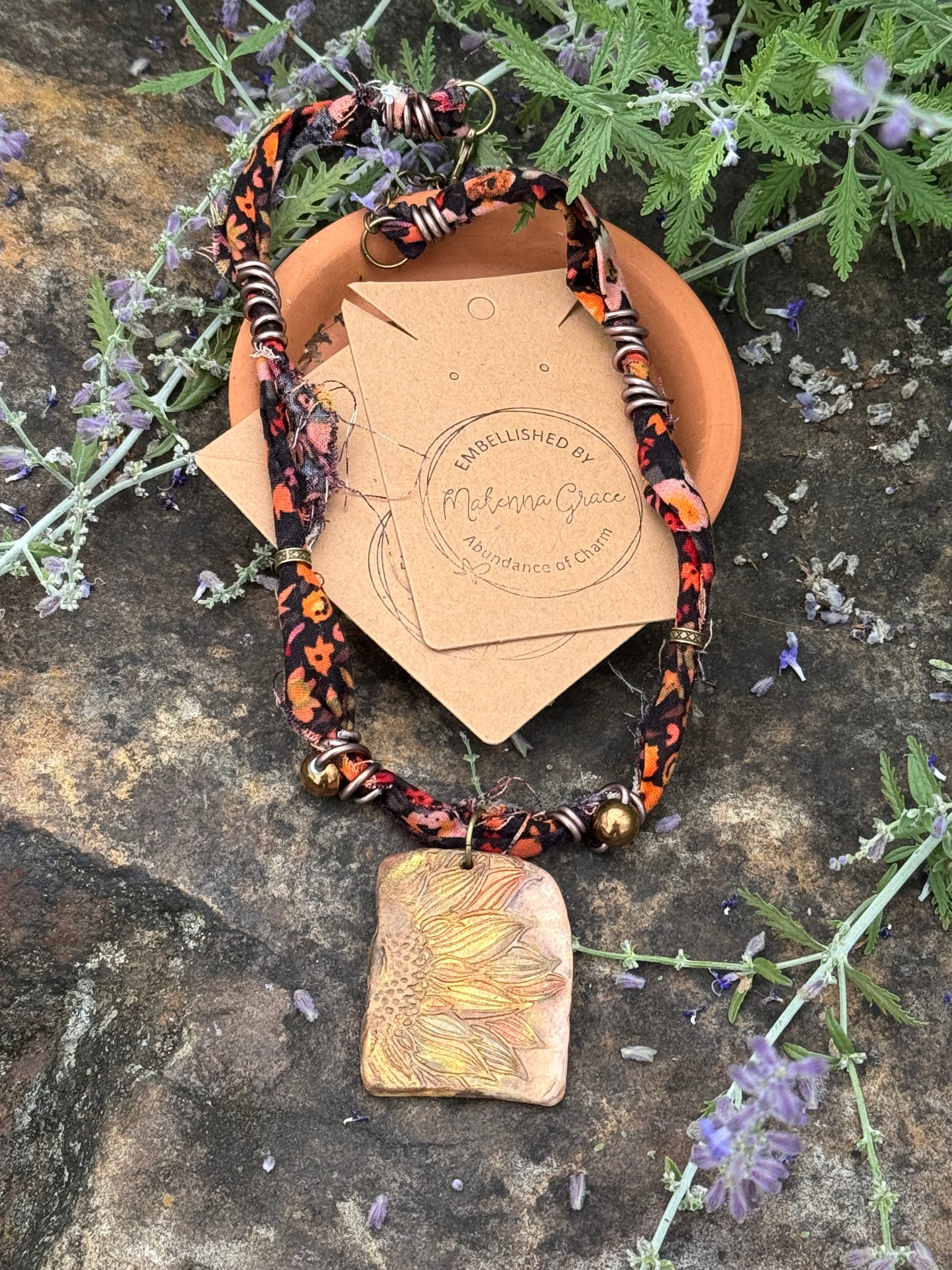 Add a charming touch to your outfit with this Fabric Pendant Necklace! Featuring colorful fabric in browns and oranges, accented with beads and a hand painted vibrant sunflower pendant. This necklace is great for layering with a shorter necklace for a custom stacked look. Elevate your style with this charming accessory. FN1030