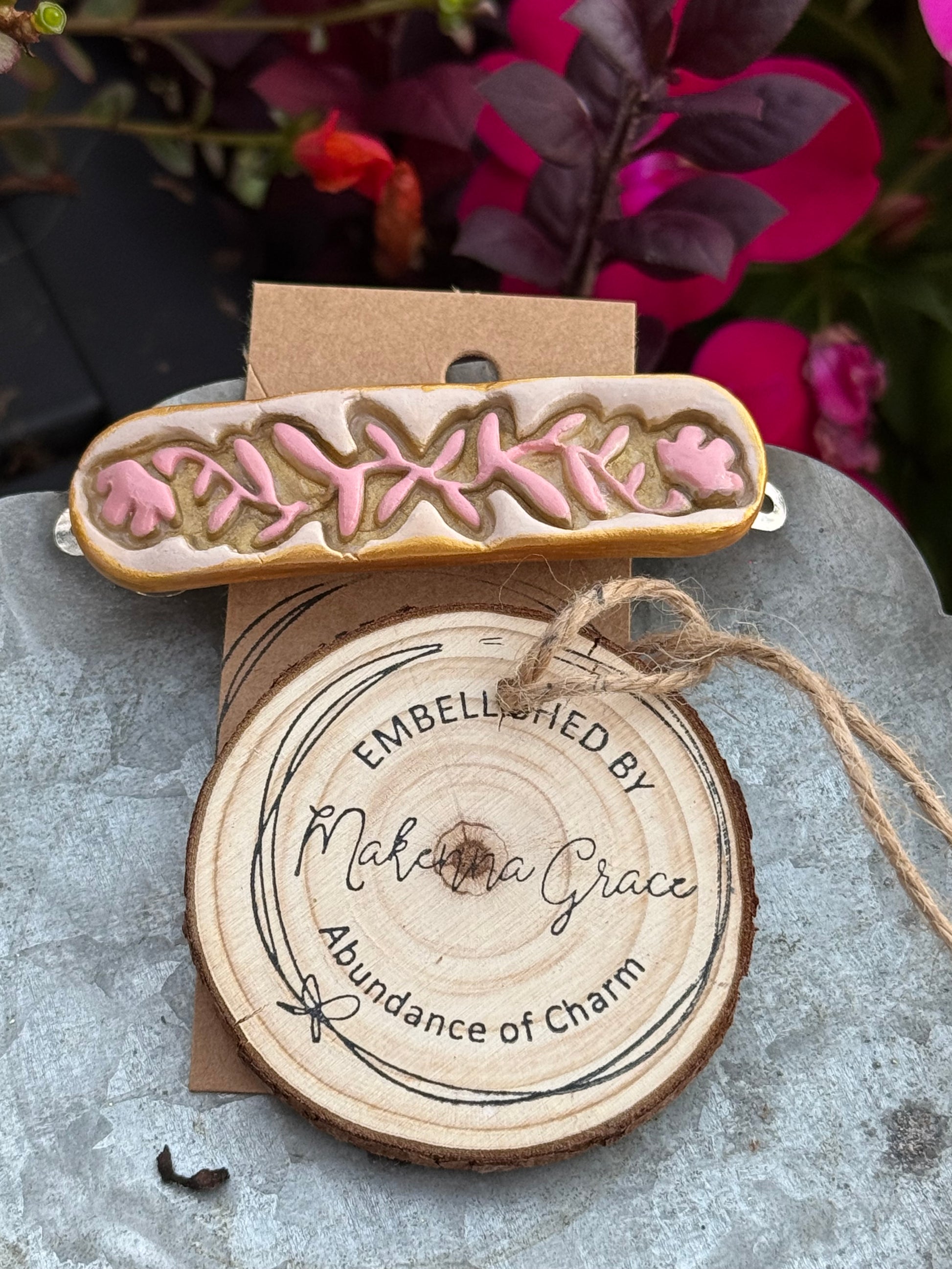 Enhance your look with the Hand Painted Clay Barrette, a perfect blend of artistry and function. Each piece is meticulously hand painted to offer a unique accessory that secures your hair with style. This barrette not only holds your hair in place but also adds an elegant, one-of-a-kind touch that elevates any outfit effortlessly. Choose this distinctive piece to express your individuality and confidence every day. BAR106