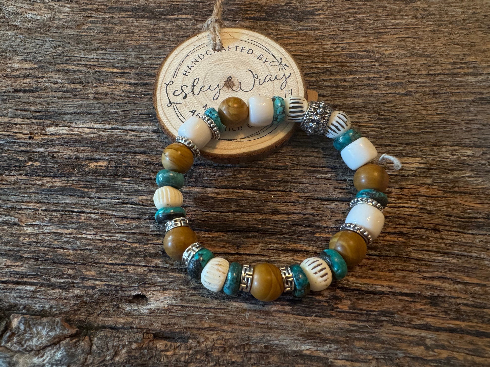 This boho-inspired bracelet is a hand crafted piece featuring African Turquoise round beads and round bone beads with silver accent beads. Its stretch design adds versatility and ease of wear. Made with quality materials, this bracelet will add a touch of earthy elegance to any outfit. STBR102